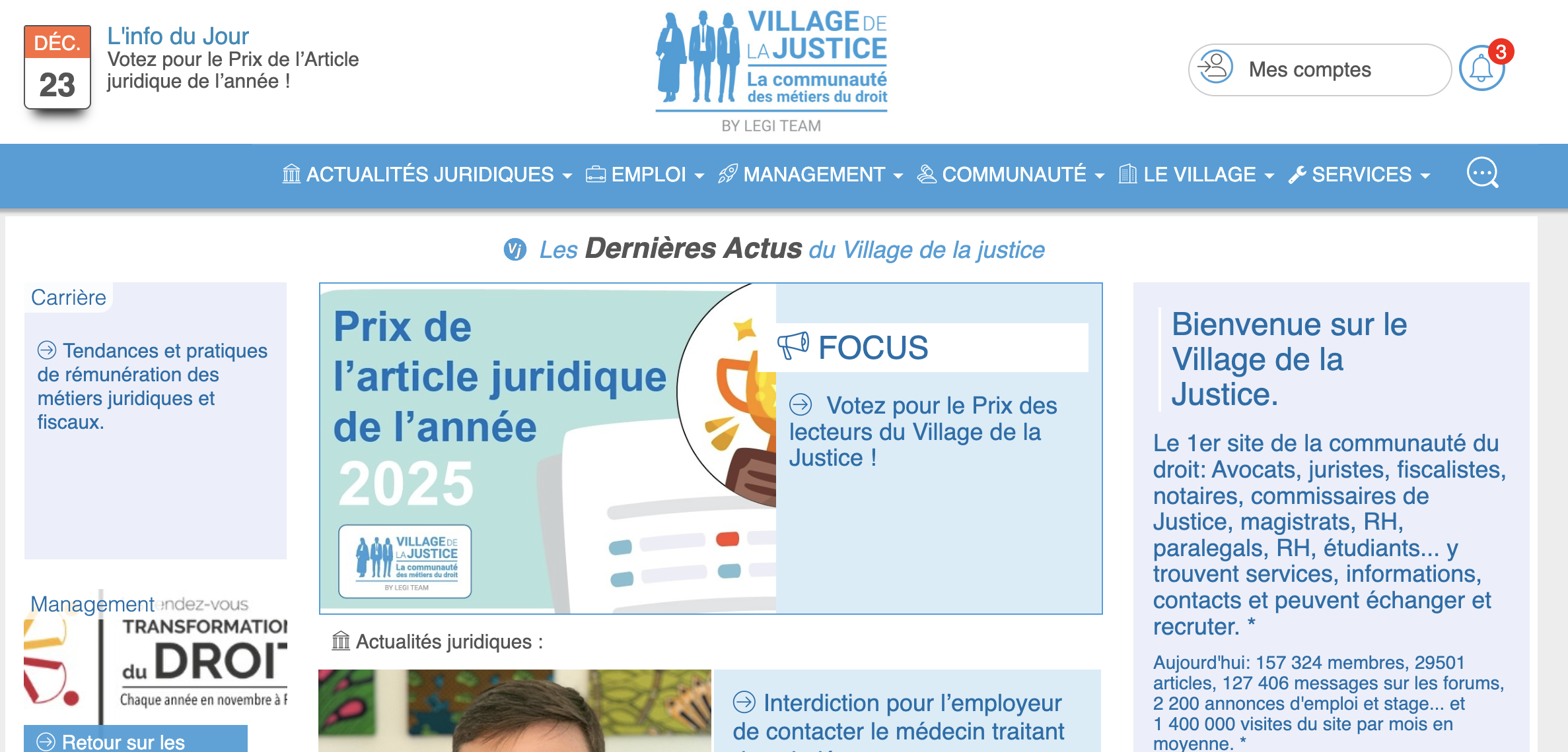 Le Village de la Justice constitue la première communauté en ligne des professionnels du droit en France avec des dizaines de milliers de visiteurs mensuels incluant avocats, juristes, magistrats, étudiants en droit et autres professionnels juridiques. Cette audience massive et qualifiée représente un vivier potentiel considérable pour vos recrutements.