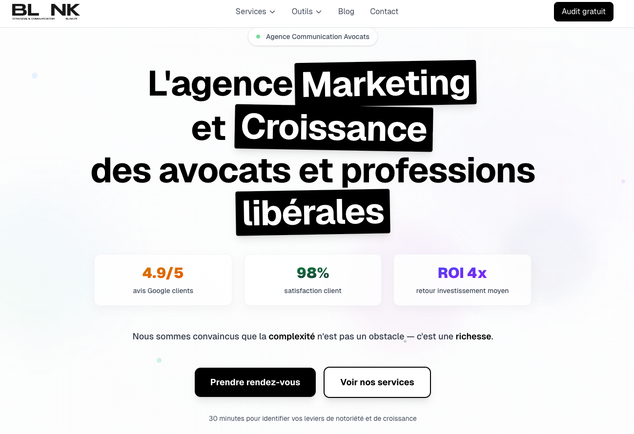 BL NK se positionne comme une agence digitale accompagnant diverses professions libérales réglementées, incluant les cabinets d'avocats dans leur portefeuille clients. Leur approche vise à combiner expertise technique, respect des contraintes déontologiques et stratégie digitale adaptée.