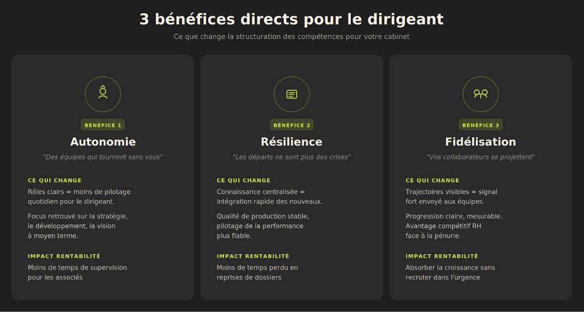 C’est cet angle que nous explorons ici : comment passer d’une gestion artisanale des compétences à un système structuré, un système où votre cabinet capitalise sur ce qu’il apprend et où l’autonomie de vos équipes devient un vrai levier de performance.