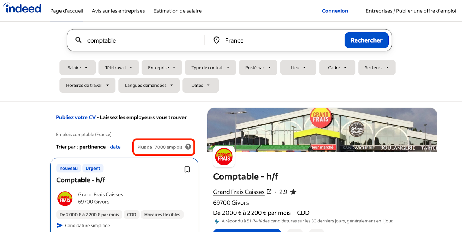 Car c'est l'autre réalité qu'il ne faut pas ignorer : le marché des collaborateurs comptables est structurellement en tension. On se rapproche des 30 000 postes vacants (source) et on comptabilise aujourd’hui 17 000 offres d’emploi rien que sur Indeed. Les bons profils sont rares, sollicités et, par conséquent, exigeants. Si vous attendez d'être dos au mur pour recruter, vous recruterez dans l'urgence, avec moins de choix et probablement à un coût plus élevé.
