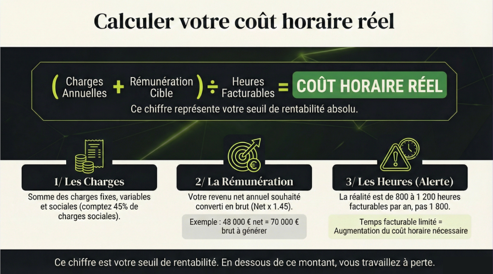 Avant de fixer le moindre tarif, vous devez connaître un chiffre fondamental : votre coût horaire réel. C'est le montant en dessous duquel chaque heure travaillée vous coûte de l'argent au lieu de vous en rapporter.