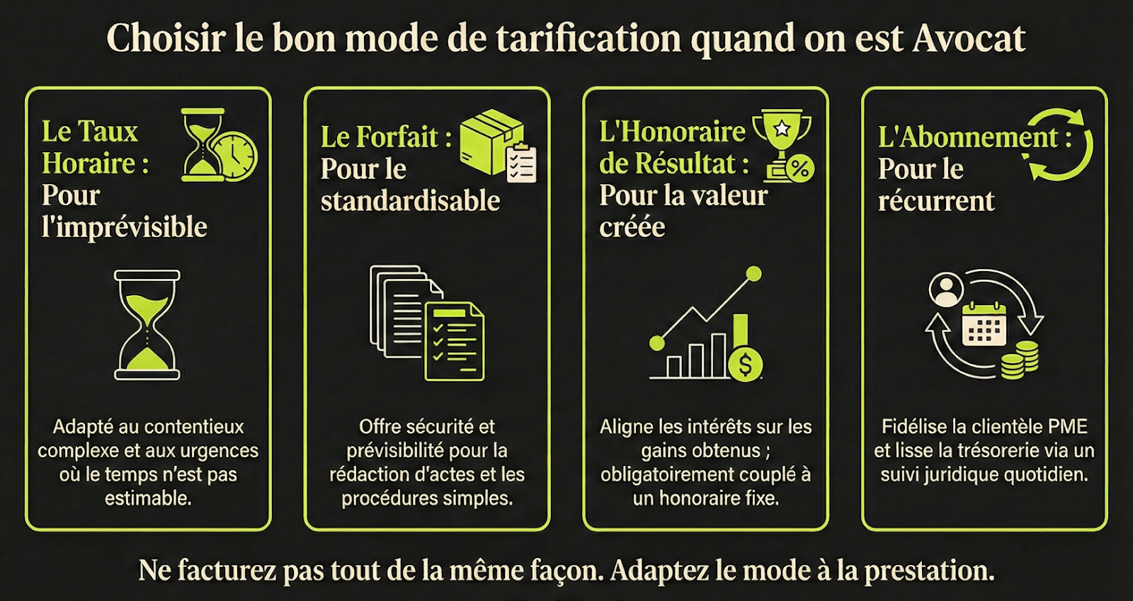 | Contentieux complexe | Taux horaire + résultat | Issue incertaine ; permet d’aligner les intérêts du cabinet et du client |