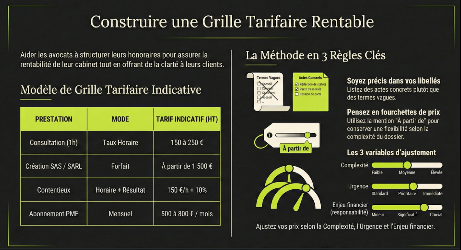 Honoraires d'avocat : comment calculer votre coût horaire réel, choisir le bon mode de tarification et construire une grille tarifaire rentable. Guide pratique.