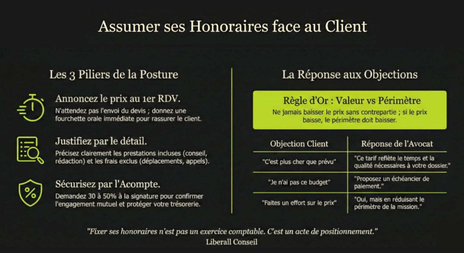 Beaucoup d'avocats repoussent le moment de parler d'argent. Ils font un premier rendez-vous, analysent le dossier, puis envoient un devis par mail quelques jours plus tard. Erreur.