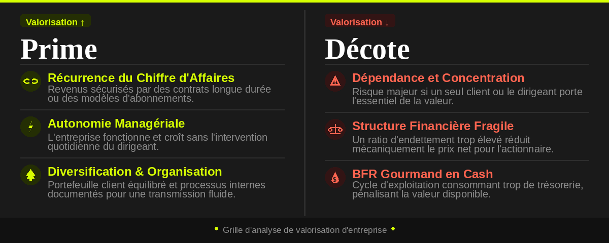 C'est ici que le travail de valorisation prend une autre dimension. Les critères extra-financiers (souvent appelés "facteurs de prime ou de décote") sont ceux qui expliquent pourquoi deux entreprises avec le même EBITDA ne valent pas la même chose.