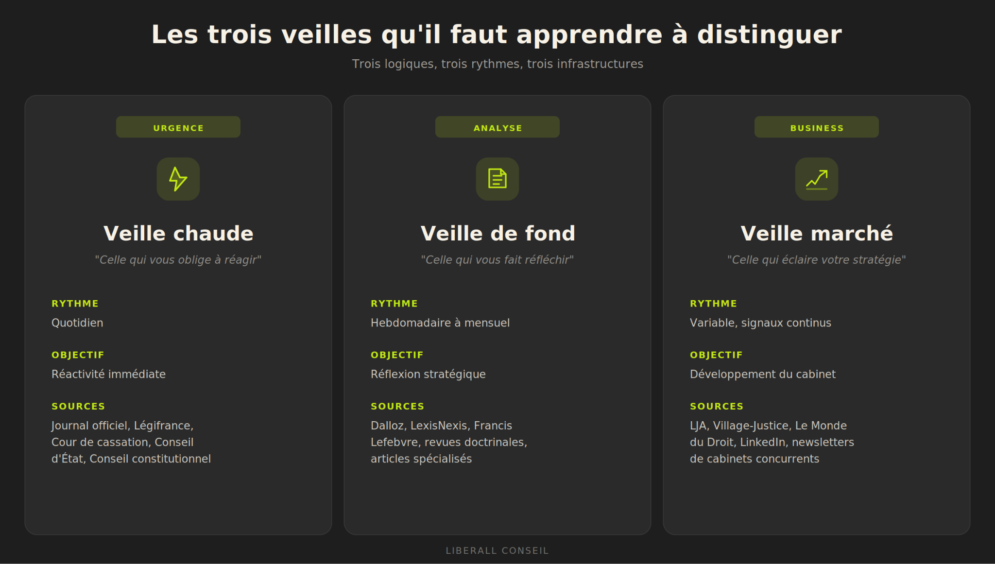 Première erreur qui tue la veille avant même qu’elle commence : la traiter comme un bloc unique. Il n’existe pas "une" veille juridique dans votre cabinet d’avocat, vous en avez au moins trois qui cohabitent, avec des logiques, des rythmes et des sources qui n’ont rien à voir entre elles.