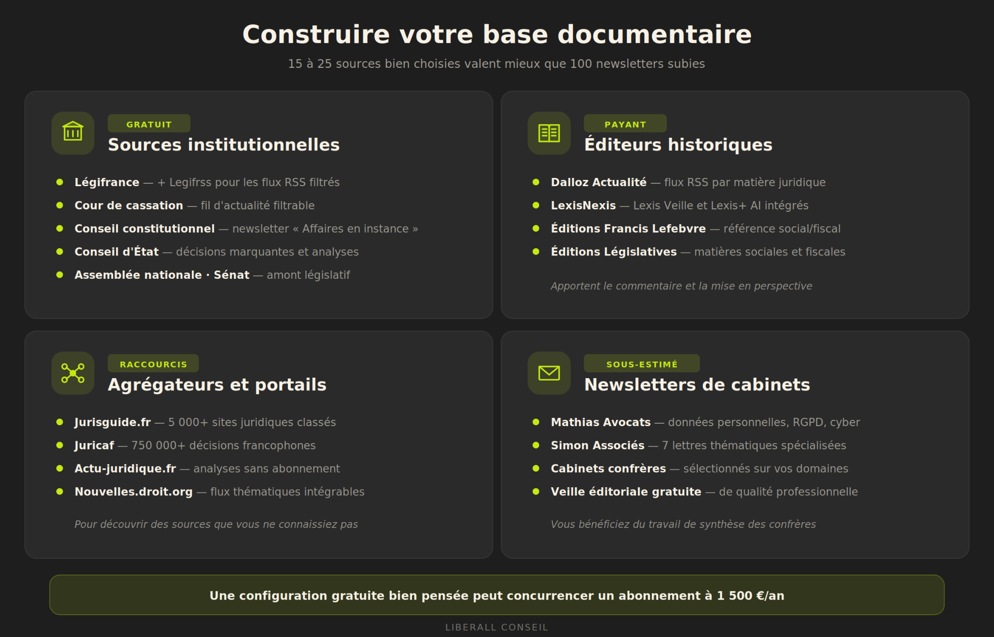 Un point qui peut vous éviter des dépenses inutiles : une configuration gratuite bien pensée, avec les bonnes sources institutionnelles et quelques newsletters ciblées, peut largement concurrencer un abonnement payant à 1 500 € par an.