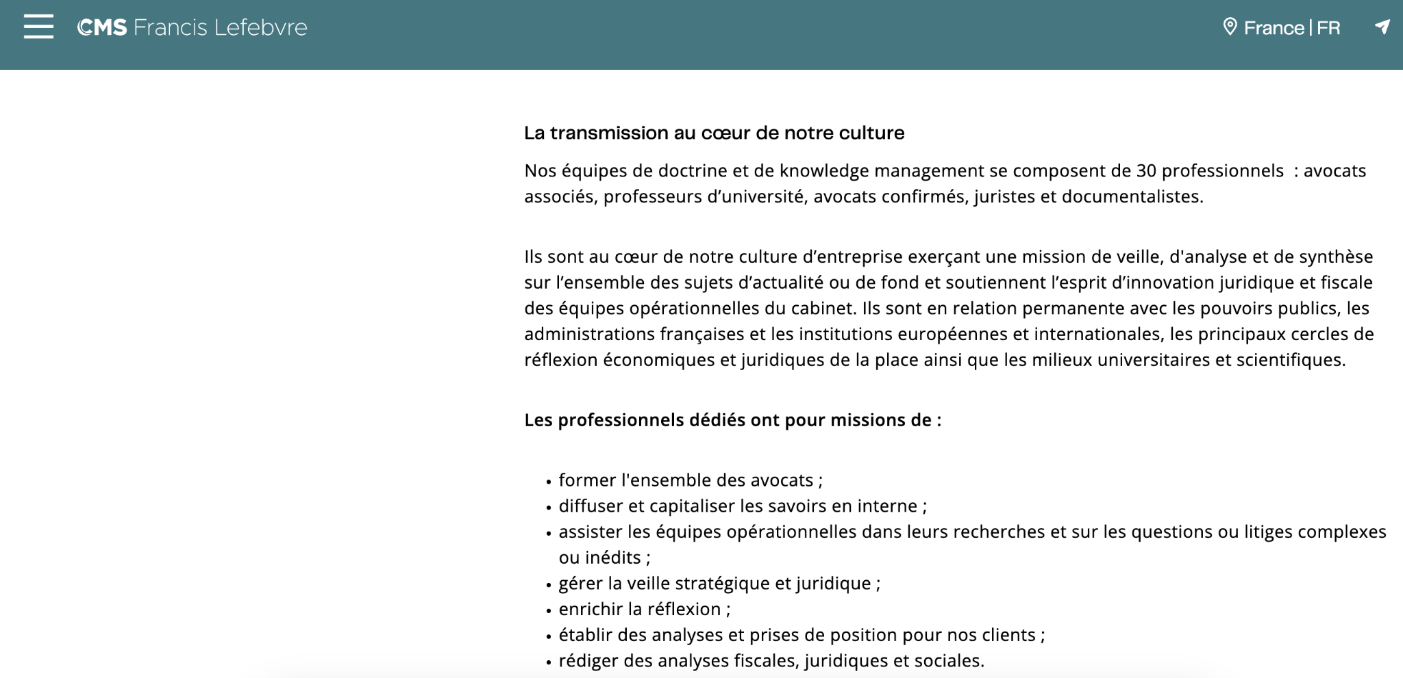 En France, ils sont quelques dizaines, concentrés dans les grands cabinets d’affaires internationaux : DLA Piper, CMS Francis Lefebvre (qui réunit 30 professionnels entre doctrine et knowledge management), Herbert Smith Freehills, Freshfields avec cinq KML rien que pour cette fonction, Linklaters. Le cabinet Fidal a systématisé le rôle au point d’avoir au moins un KML par département.