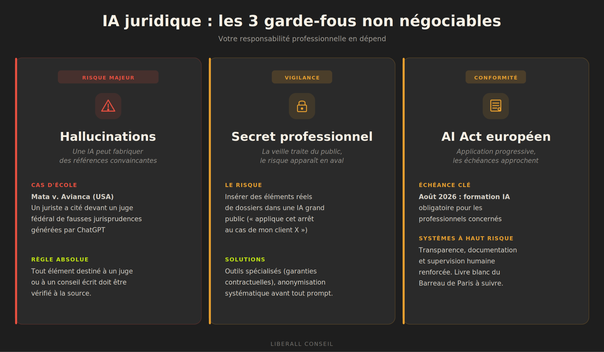Le risque apparaît en aval : quand vous demandez à une IA grand public de synthétiser en intégrant des éléments réels de vos dossiers ("applique cette nouvelle jurisprudence au cas de mon client X"), vous exposez potentiellement des données couvertes par le secret.