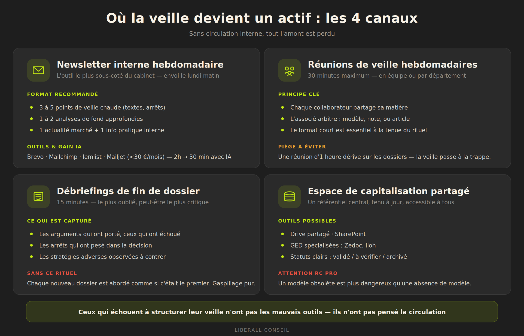 Jusqu’ici, tout l’effort que nous avons décrit est un effort de collecte et de synthèse. C’est nécessaire, mais ça ne suffit pas. Parce que la veille ne vaut strictement rien tant qu’elle ne circule pas. Si l’information reste dans le Feedly de l’associé référent, elle n’existe pas pour le cabinet. Le retour sur investissement de toute votre infrastructure arrive dans cette dernière étape et c’est souvent celle qui fait défaut dans les cabinets d’avocat qui ont pourtant bien travaillé l’amont.